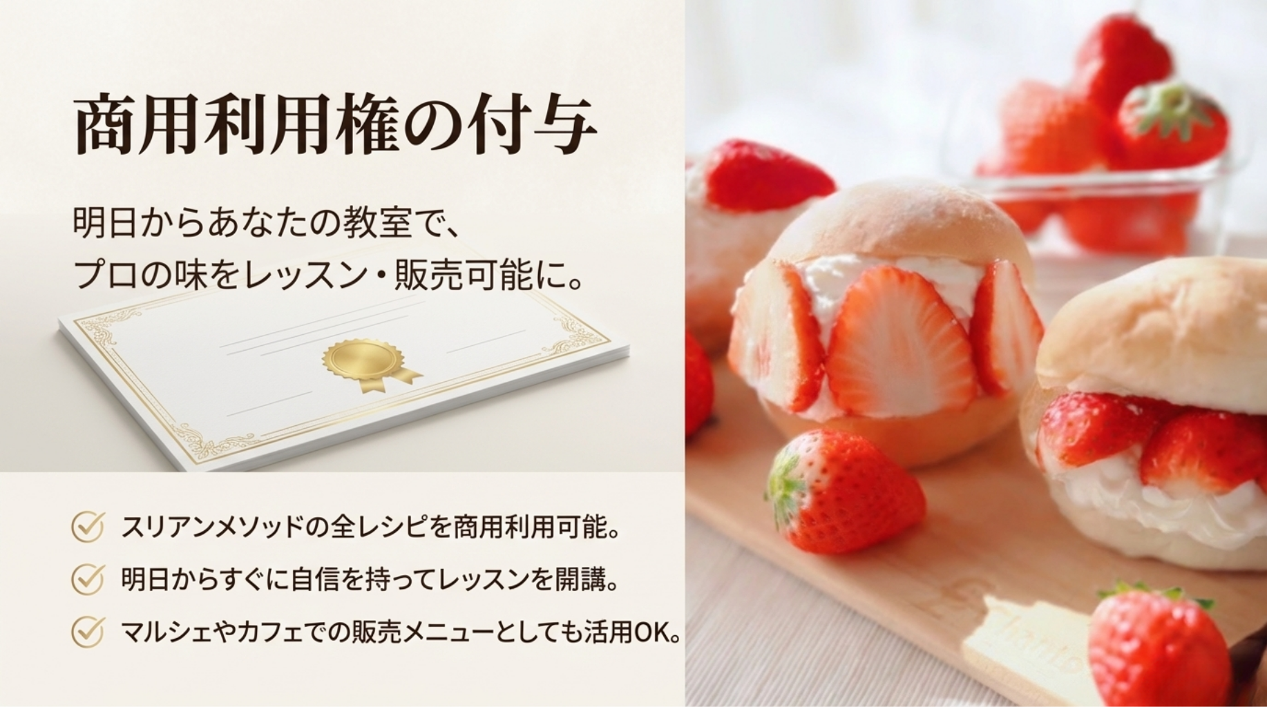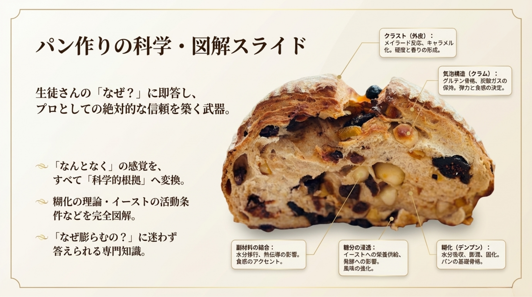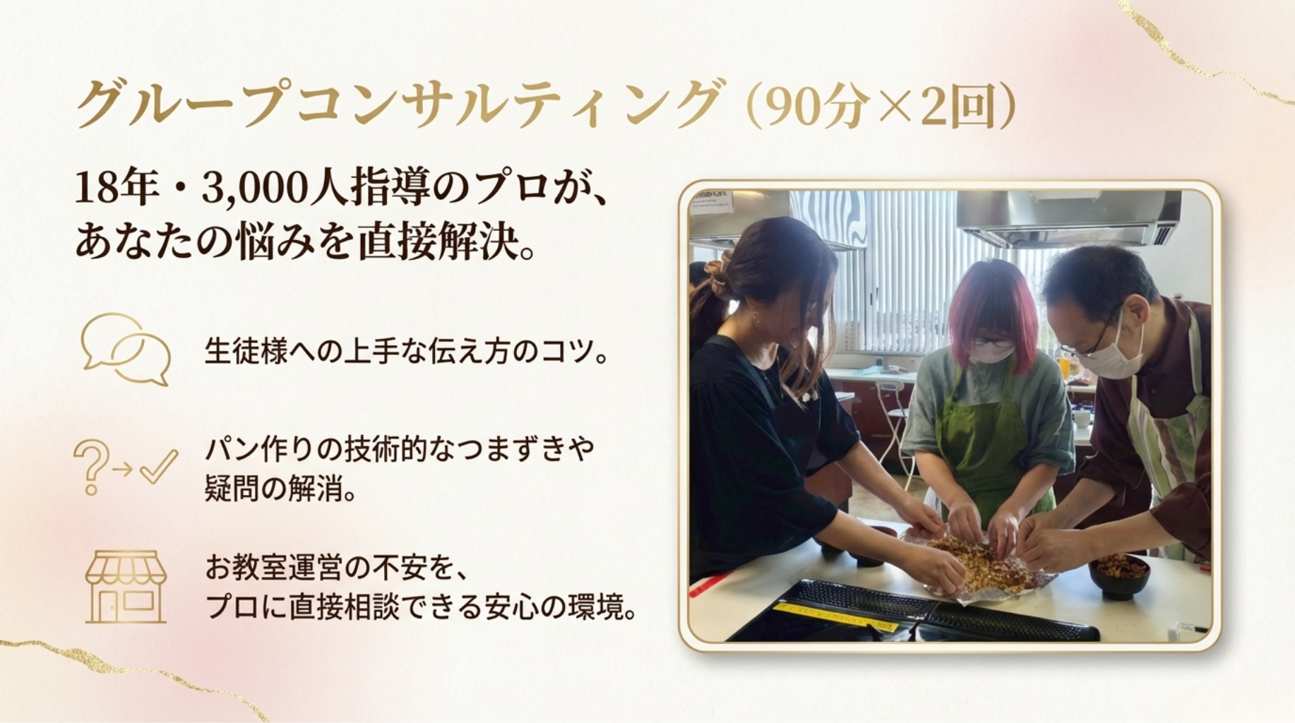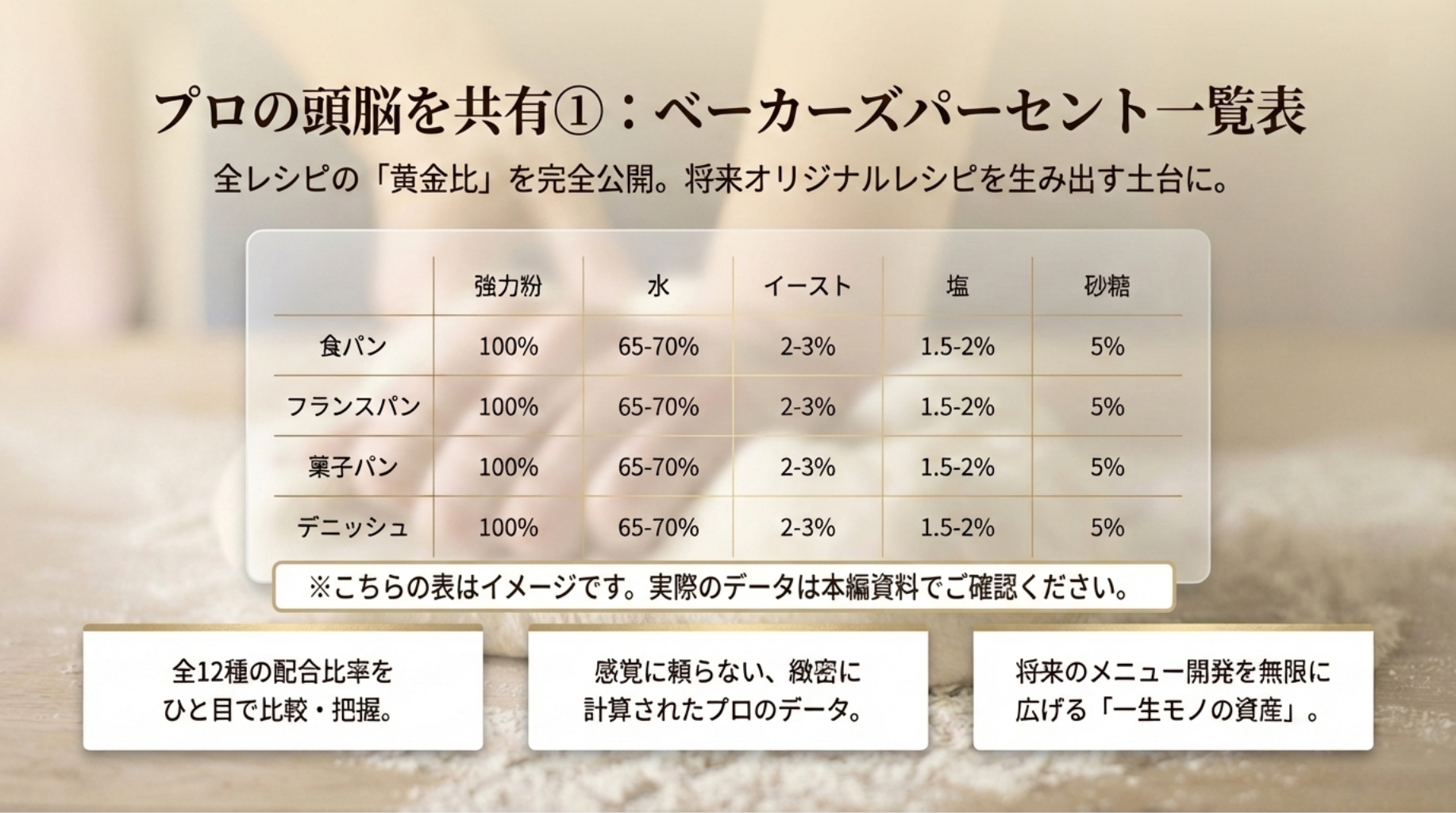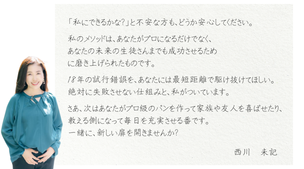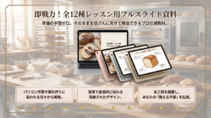 土台がないまま応用をやっても、本当の美味しさには届きません。本講座は計量の基礎 から始まり、素材の扱い、成形、クープまで、1番から順に階段を登るだけでプロの技術 が身につく「スモールステップ」で計算し尽くされています。