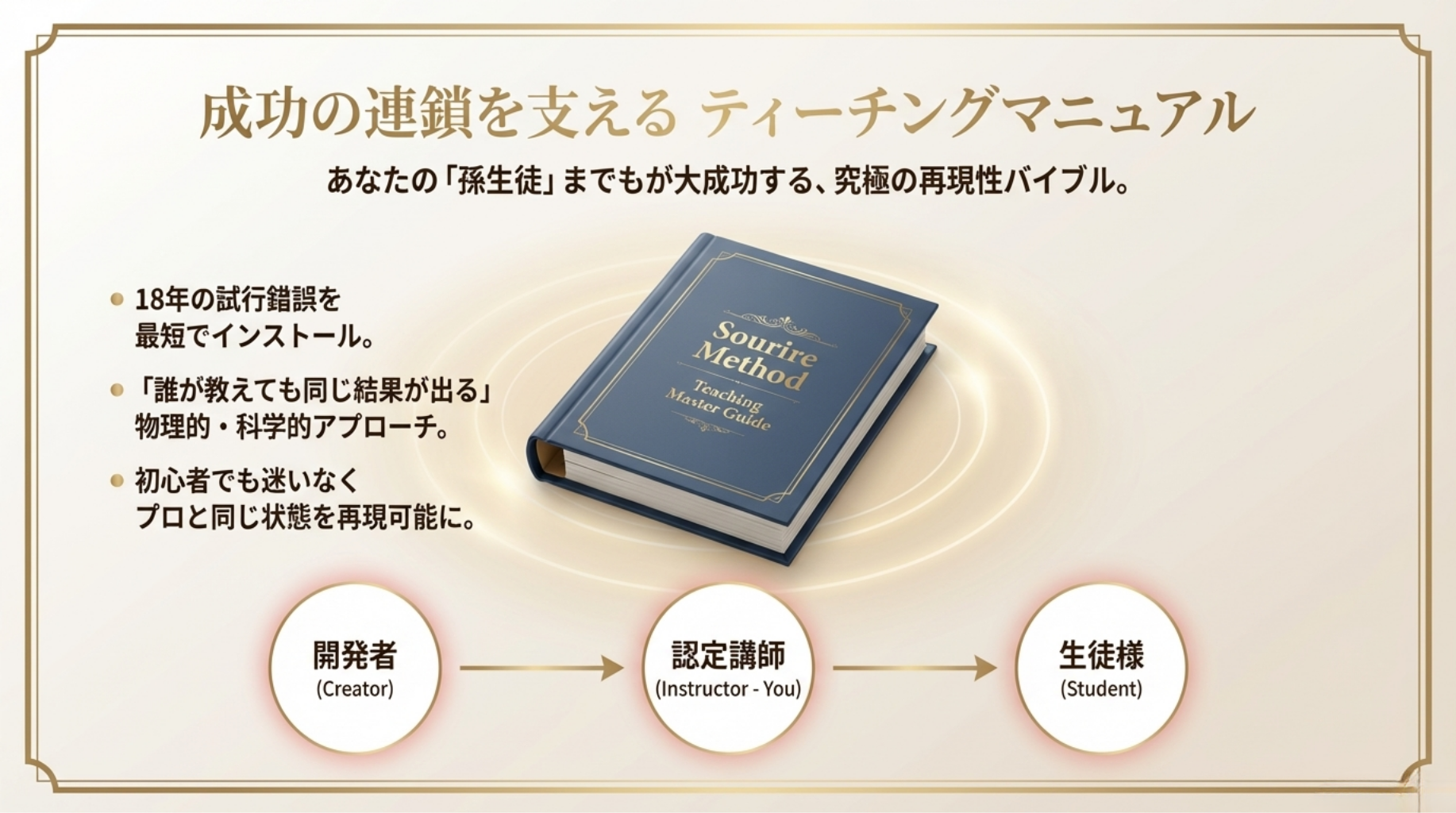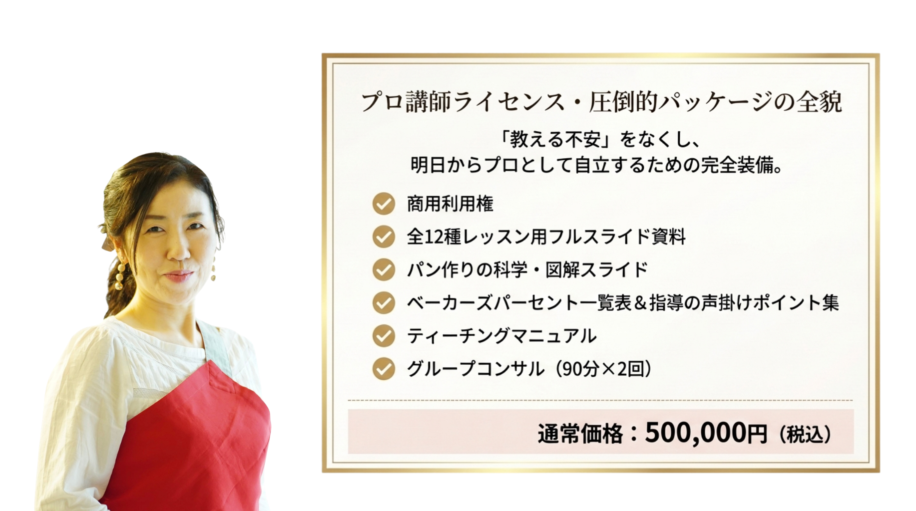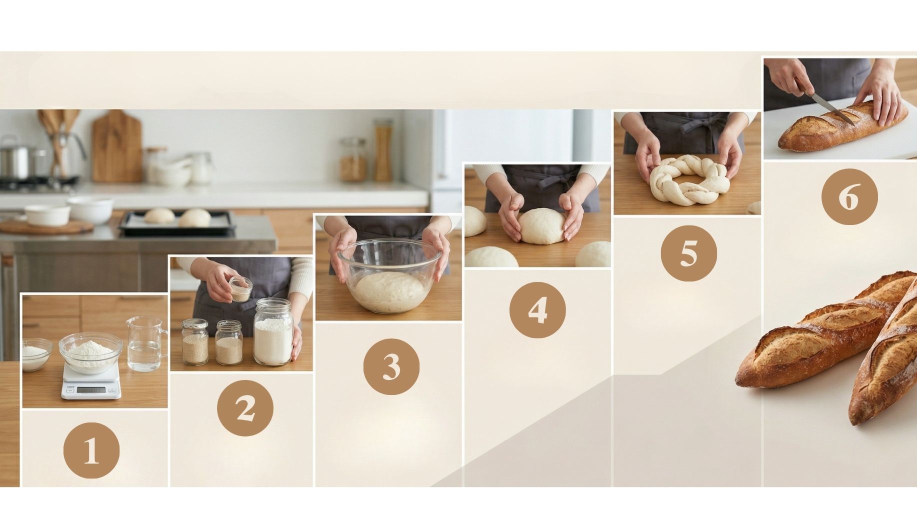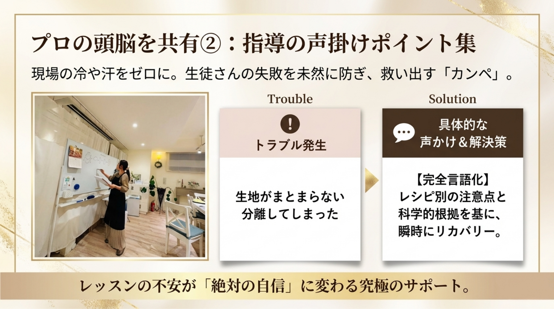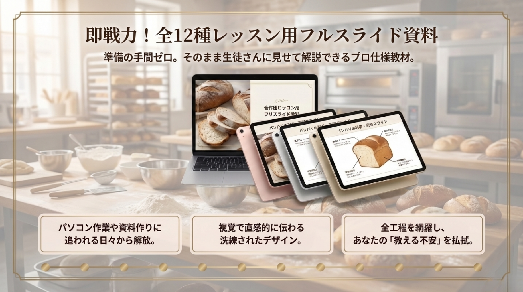 土台がないまま応用をやっても、本当の美味しさには届きません。本講座は計量の基礎 から始まり、素材の扱い、成形、クープまで、1番から順に階段を登るだけでプロの技術 が身につく「スモールステップ」で計算し尽くされています。