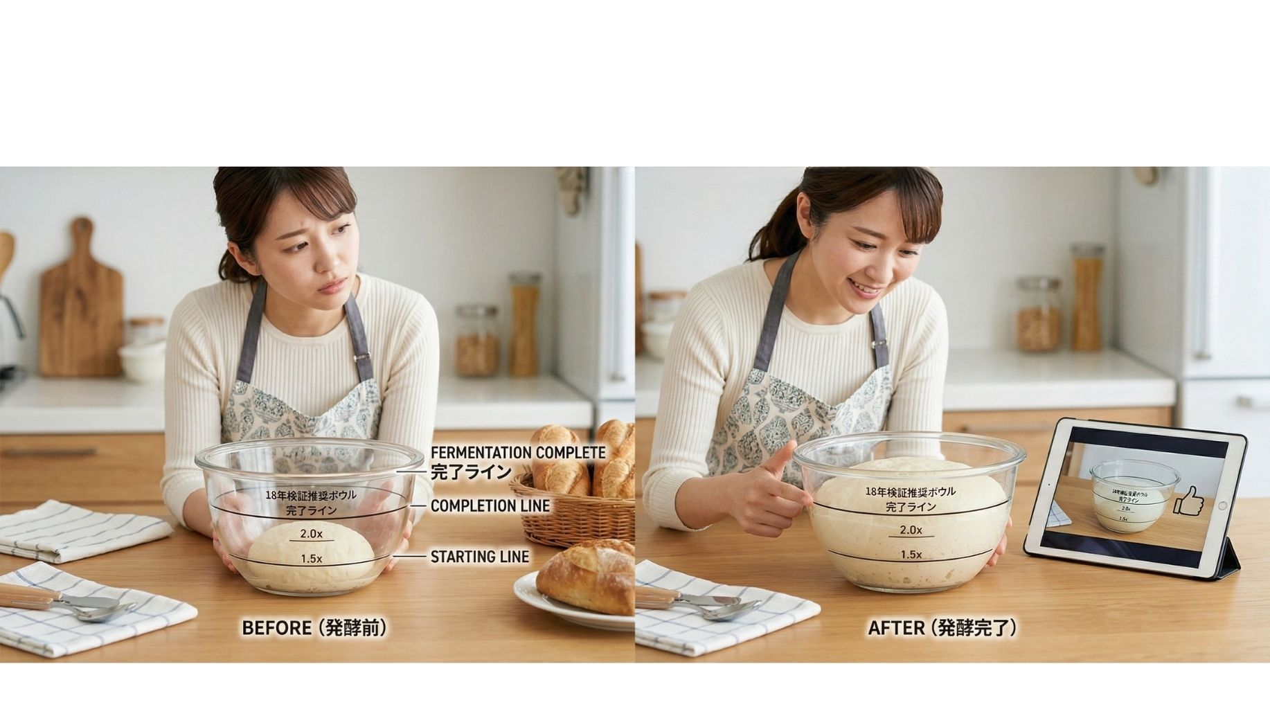 パン作り最大の難所「発酵の見極め」を物理的に解決。私が18年の検証で導き出した 「推奨ボウル」を使い、生地を動画と同じラインまで膨らませる。ただそれだけで、初心者 でも迷いなくプロと同じ発酵状態を再現できます。