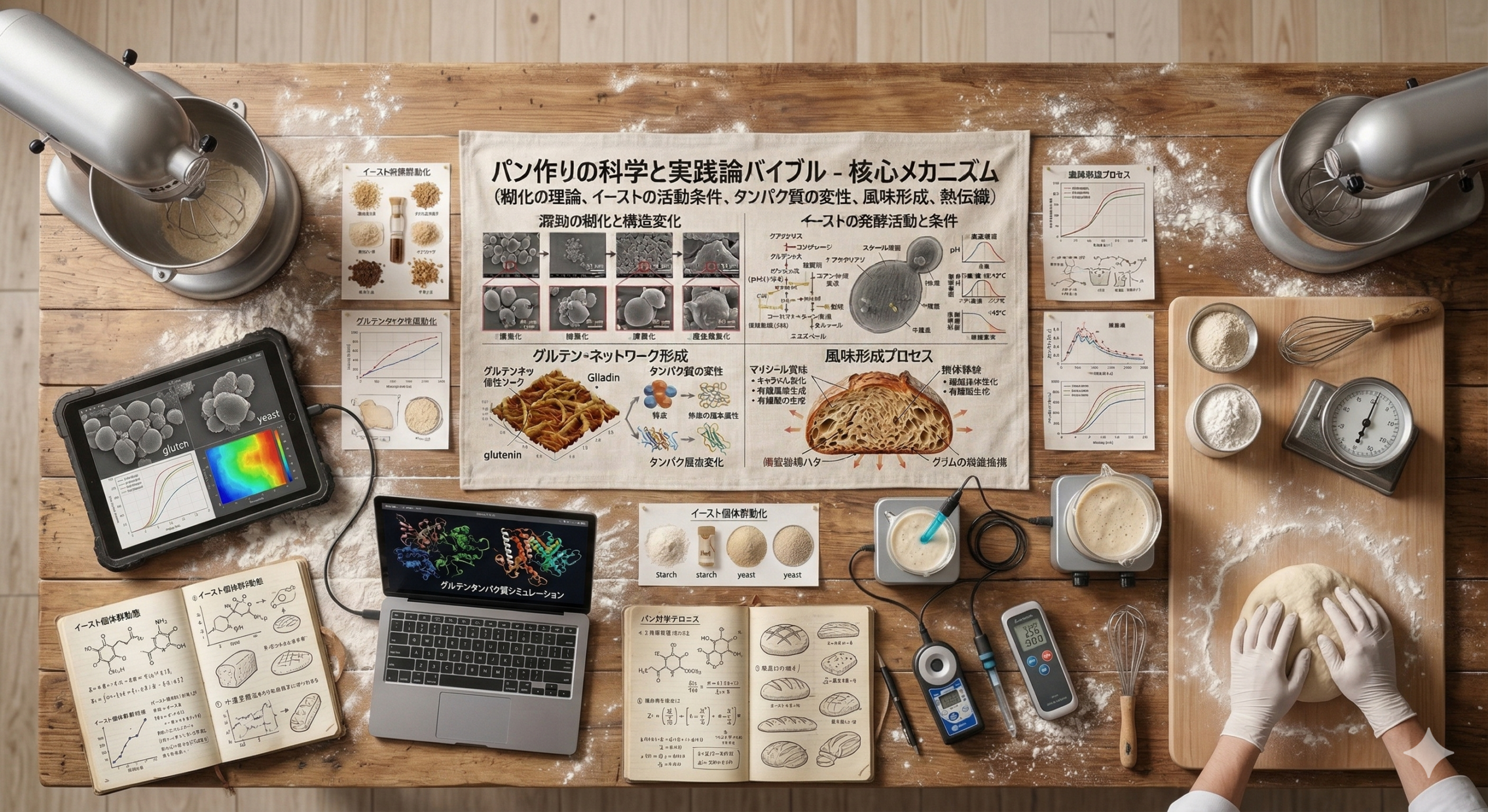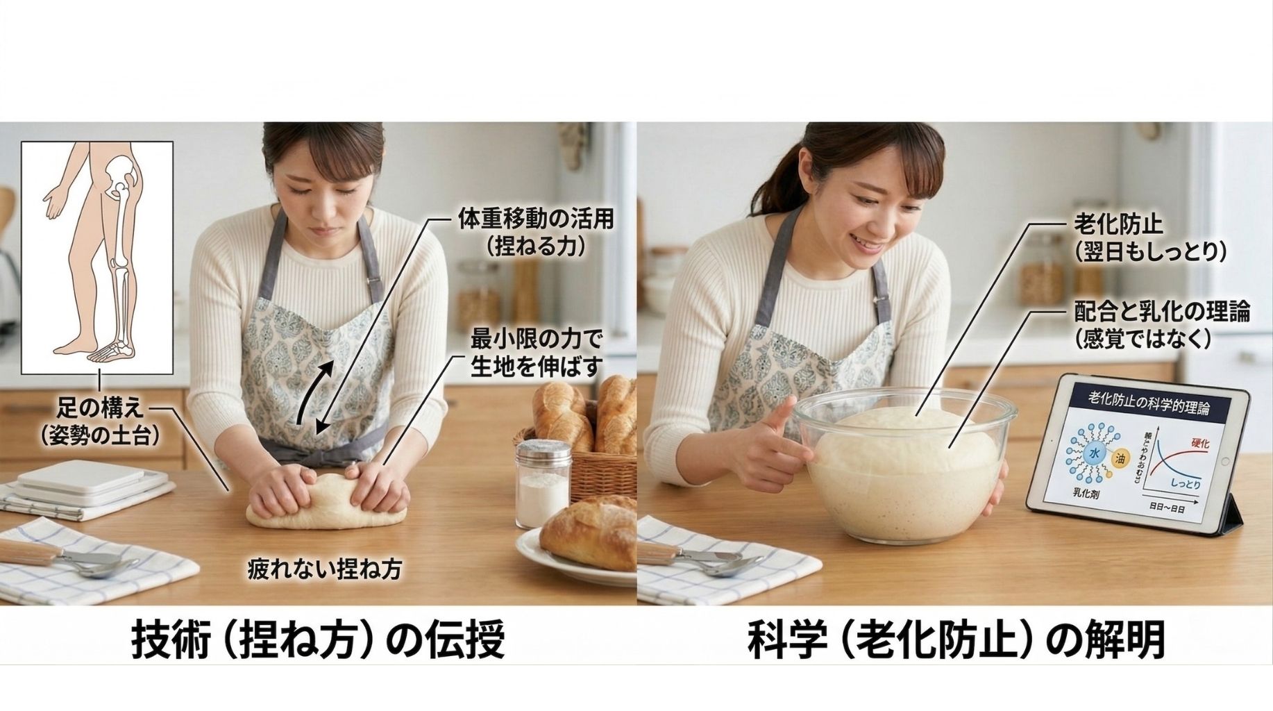 感覚ではなく配合と乳化の理論で、翌日もしっとりする理由を解明する「老化防止の科 学」。そして、足の構え方、体重移動を活用し、最小限の力で生地を伸ばす「疲れない捏 ね方」を伝授します。